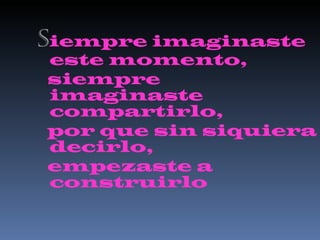 El documento habla sobre una celebración para una persona que está cumpliendo 15 años. Describe cómo siempre imaginó este momento especial y cómo ha ido creciendo de niña a mujer. Detalla a las diferentes personas que quería a su lado en esta noche especial, incluyendo amigos, familiares y compañeros. Resalta que hoy se hace realidad su ilusión y fantasía de celebrar sus 15 años.