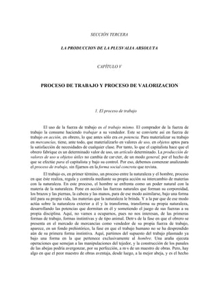 El documento describe el proceso de trabajo y los factores que intervienen en él. Resume que el proceso de trabajo involucra la actividad del trabajador usando instrumentos de trabajo sobre objetos de trabajo para crear un producto. El trabajador transforma las materias primas usando medios de producción que incluyen instrumentos de trabajo y objetos de trabajo. El resultado es un valor de uso o producto que puede servir como materia prima en otros procesos de trabajo.
