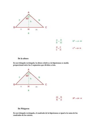 El documento presenta información sobre triángulos rectángulos y conceptos básicos de estadística. Explica que un triángulo rectángulo tiene un ángulo recto y dos agudos, y define la hipotenusa y los catetos. También resume los objetivos y métodos de la estadística descriptiva e inferencial, así como conceptos como población, muestra, variables y distribución de frecuencias.