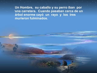 El cuento trata sobre un hombre, su caballo y su perro que mueren al ser alcanzados por un rayo. Siguen caminando hasta llegar a un lugar hermoso llamado Cielo, pero solo dejan entrar al hombre porque no permiten animales. Más adelante llegan a otro lugar donde pueden beber los tres, el cual resulta ser el verdadero Cielo, mientras que el primero era en realidad el Infierno. El mensaje es nunca abandonar a los verdaderos amigos.