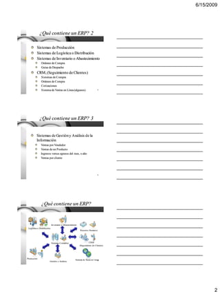 Un ERP (Enterprise Resource Planning o Planificación de Recursos Empresariales) es un sistema de información gerencial que integra varias áreas de una empresa como finanzas, contabilidad, recursos humanos, producción, logística e inventarios. Un ERP centraliza la información de toda la empresa en una base de datos única para mejorar la toma de decisiones. La implementación de un ERP es un proceso complejo que puede durar años y requiere cambios en los procesos de la empresa y capacitación del personal.