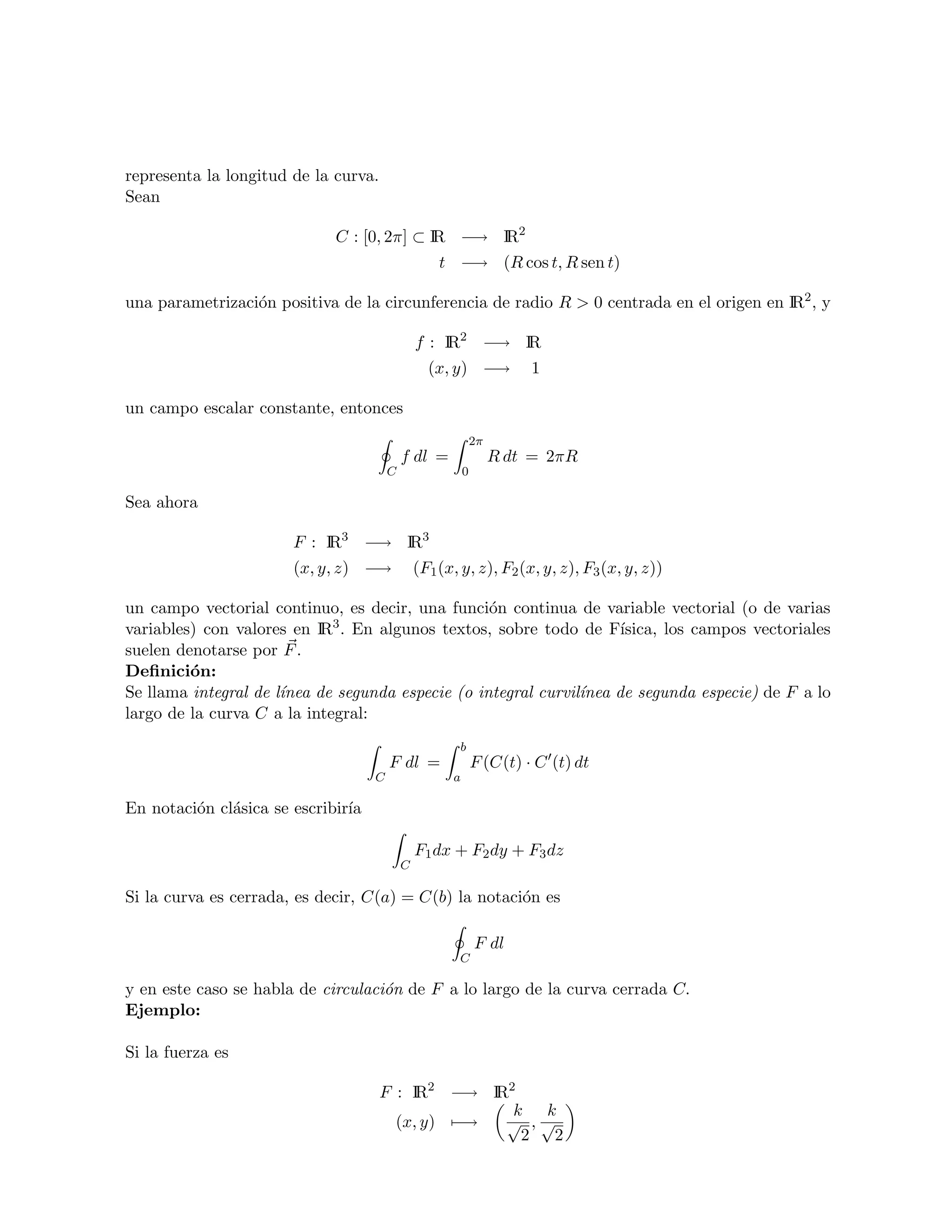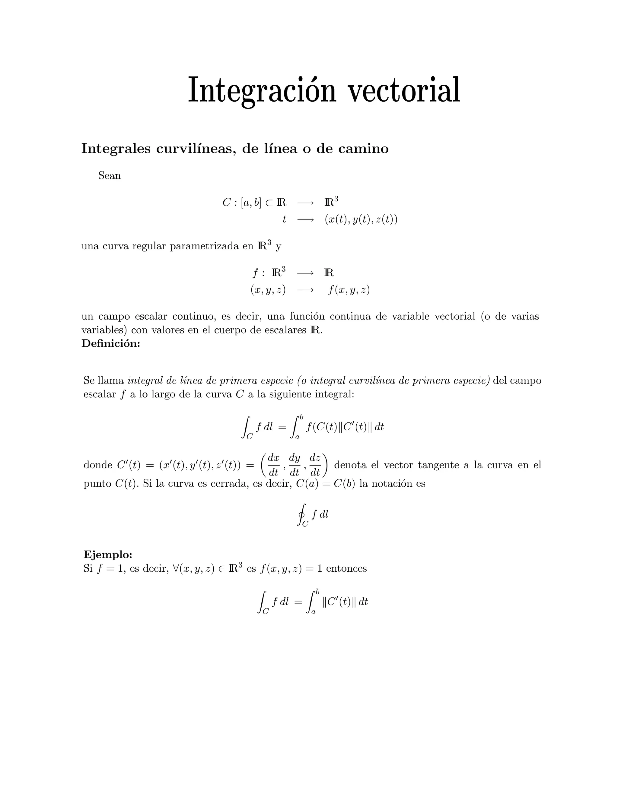 Este documento presenta definiciones y ejemplos de integrales curvilíneas y de superficie. Define la integral curvilínea de primera especie como la integral de un campo escalar a lo largo de una curva, y la integral curvilínea de segunda especie como la integral de un campo vectorial. También introduce las integrales de superficie, el rotacional y la divergencia de un campo vectorial.