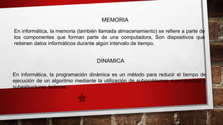 Este documento describe la memoria dinámica en informática. La memoria dinámica permite solicitar memoria en tiempo de ejecución cuando no se conoce el tamaño de los datos por adelantado. Esto se logra mediante el uso de punteros para que el sistema operativo administre la memoria de forma flexible según las necesidades del programa.