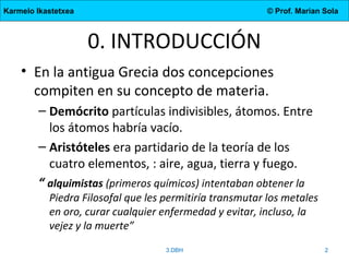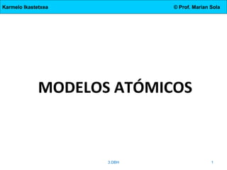 El documento describe la evolución de los modelos atómicos desde la antigua Grecia hasta el modelo actual. Comienza con las teorías de Demócrito y Aristóteles, luego describe los modelos de Dalton, Thomson, Rutherford, y Bohr. El modelo de Rutherford introdujo el concepto del núcleo atómico central. El modelo de Bohr describió los niveles de energía de los electrones y las órbitas permitidas. Los modelos posteriores incluyeron subniveles de energía y la configuración electrónica de los átomos.