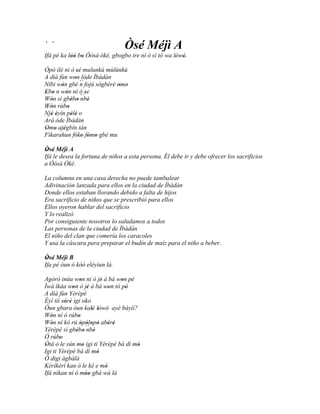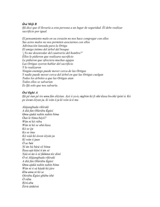 Ifá le dice a la persona que ofrezca un sacrificio para una vida larga. Debe ofrecer el sacrificio para tener tiempo, espacio y un ambiente propicio para prosperar. La adivinación fue lanzada para Rèmílékún Onígbò Afonran sobre un hechizo de muerte en Òwìnnì. Se le prescribió un sacrificio y Rèmílékún lo ofreció, ganando riqueza y prosperidad.