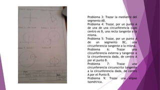 Este documento presenta los problemas resueltos en una clase de Geometría 1. Incluye la solución a 13 problemas relacionados con conceptos geométricos como la recta tangente, circunferencias tangentes, elipses, espirales y cicloides. Las soluciones fueron dibujadas primero en borrador en papel opaco y luego limpias en papel albanene transparente.