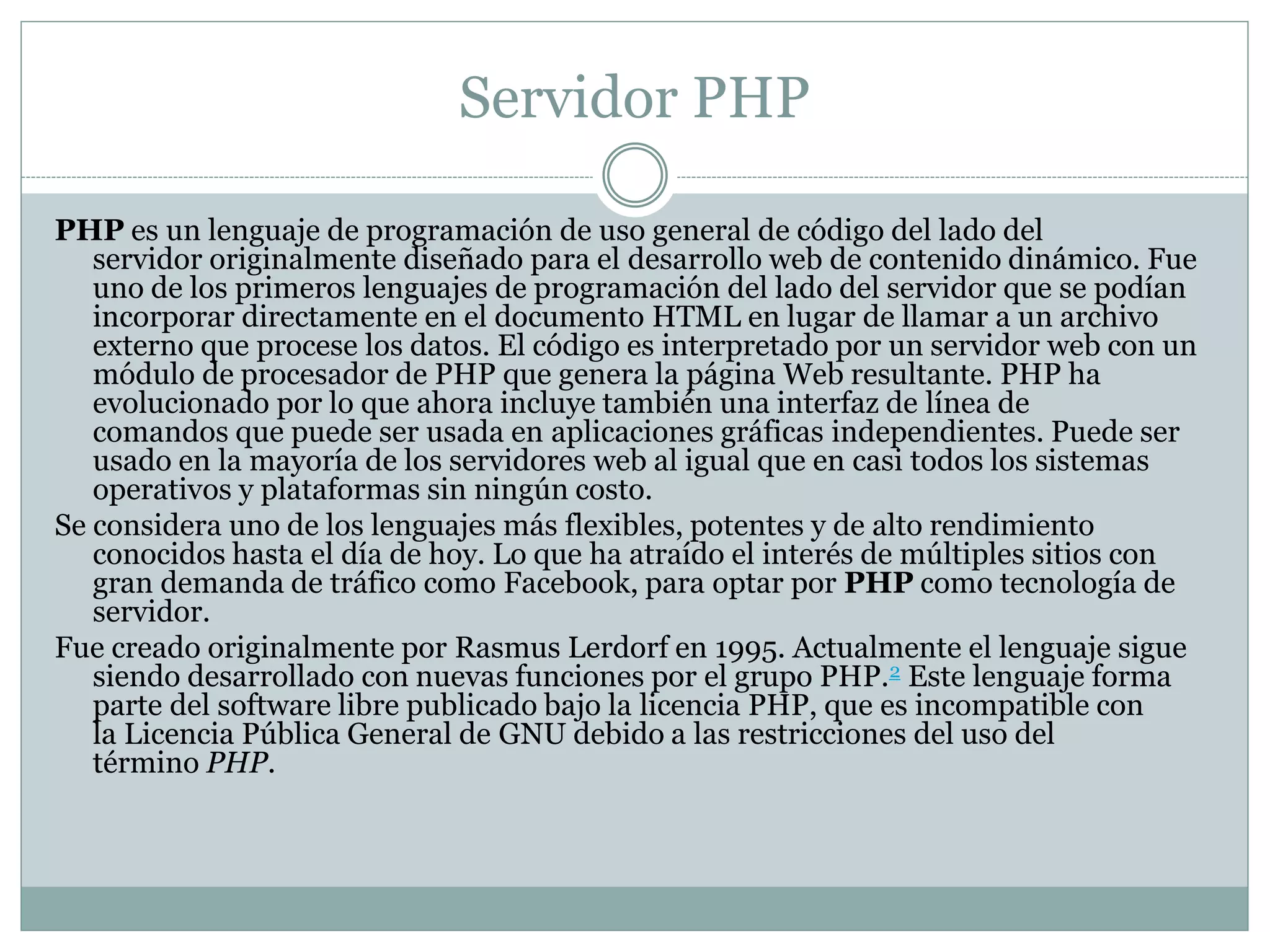 PHP es un lenguaje de programación de código abierto y multiplataforma originalmente diseñado para el desarrollo web dinámico. Fue creado por Rasmus Lerdorf en 1994 y desde entonces ha evolucionado mucho, con nuevas versiones que mejoran el rendimiento, soporte a bases de datos y funcionalidades. PHP es uno de los lenguajes más populares para crear sitios web dinámicos debido a su flexibilidad, rendimiento y capacidad de conexión a bases de datos.