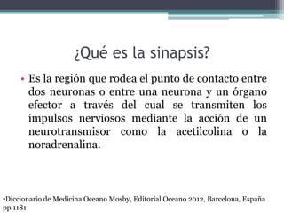 La sinapsis es la región de contacto entre dos neuronas donde se transmite la señal nerviosa a través de neurotransmisores. Santiago Ramón y Cajal describió estas zonas de comunicación entre neuronas y Charles Sherrington las llamó sinapsis. Existen sinapsis eléctricas donde los iones fluyen directamente entre las neuronas, y sinapsis químicas donde la señal se transmite por neurotransmisores a través de la hendidura sináptica.