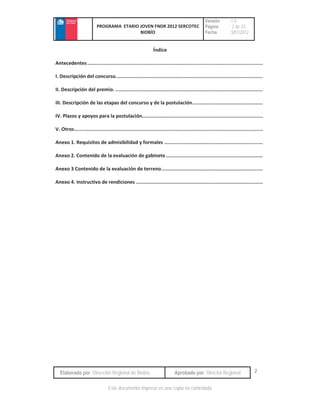 Este documento describe un programa de financiamiento para jóvenes emprendedores en la región de Biobío. El programa otorga subsidios no reembolsables de entre $1 y $2 millones para proyectos de nuevos negocios o fortalecimiento de micro y pequeñas empresas dirigidas por jóvenes de 19 a 35 años. Los postulantes deben presentar un plan de negocios que será evaluado en distintas etapas. Los fondos pueden usarse para activos fijos (hasta 60%) o capital de trabajo (hasta 40%) y el programa inclu