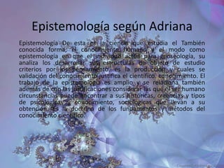 La epistemología estudia el conocimiento humano y cómo se desarrolla. Incluye considerar las circunstancias históricas, psicológicas y sociológicas que llevan a la obtención del conocimiento. Analiza los criterios por los cuales se justifica el conocimiento científico. Es amplio y se relaciona con las justificaciones que el ser humano puede encontrar a sus creencias y tipos de conocimiento.