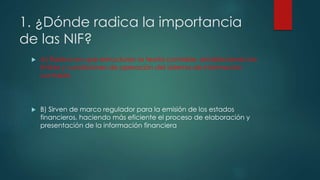 Las Normas de Información Financiera (NIF) establecen la estructura de la teoría contable y sirven de marco regulador para la emisión de los estados financieros. Surgen por la necesidad de unas normas en respuesta a las necesidades de los usuarios de la información financiera. Las NIF particulares establecen las bases para reconocer contablemente los elementos de los estados financieros y se clasifican en normas aplicables a conceptos específicos.