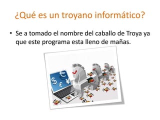 Los troyanos y gusanos son programas maliciosos que pueden dañar los sistemas. Los troyanos se disfrazan de programas útiles pero causan daño una vez instalados, mientras que los gusanos se propagan automáticamente de un sistema a otro como los virus. Ambos pueden borrar archivos u ocasionar otros daños serios si no son detectados por antivirus.