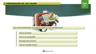 Este documento trata sobre la planificación de viajes y la prevención de accidentes de tráfico. Se discuten temas como elegir el día, hora e itinerario adecuados para el viaje, revisar el estado del vehículo antes de salir, y colocar el equipaje de manera segura. También analiza las causas comunes de los accidentes, como el exceso de velocidad, las distracciones y el alcohol, así como los grupos de mayor riesgo como los jóvenes, personas mayores, peatones, ciclistas y motoristas. El objetivo