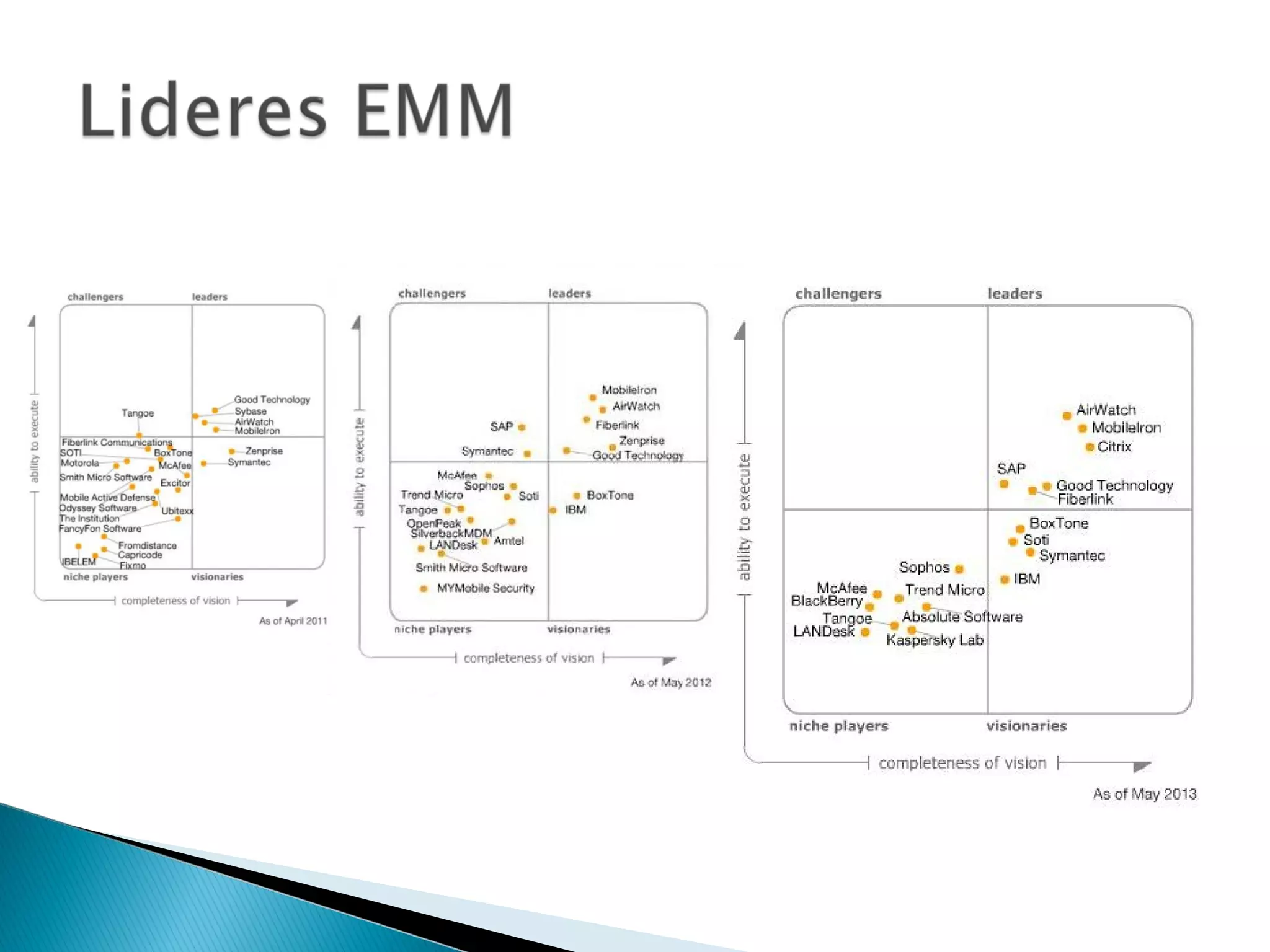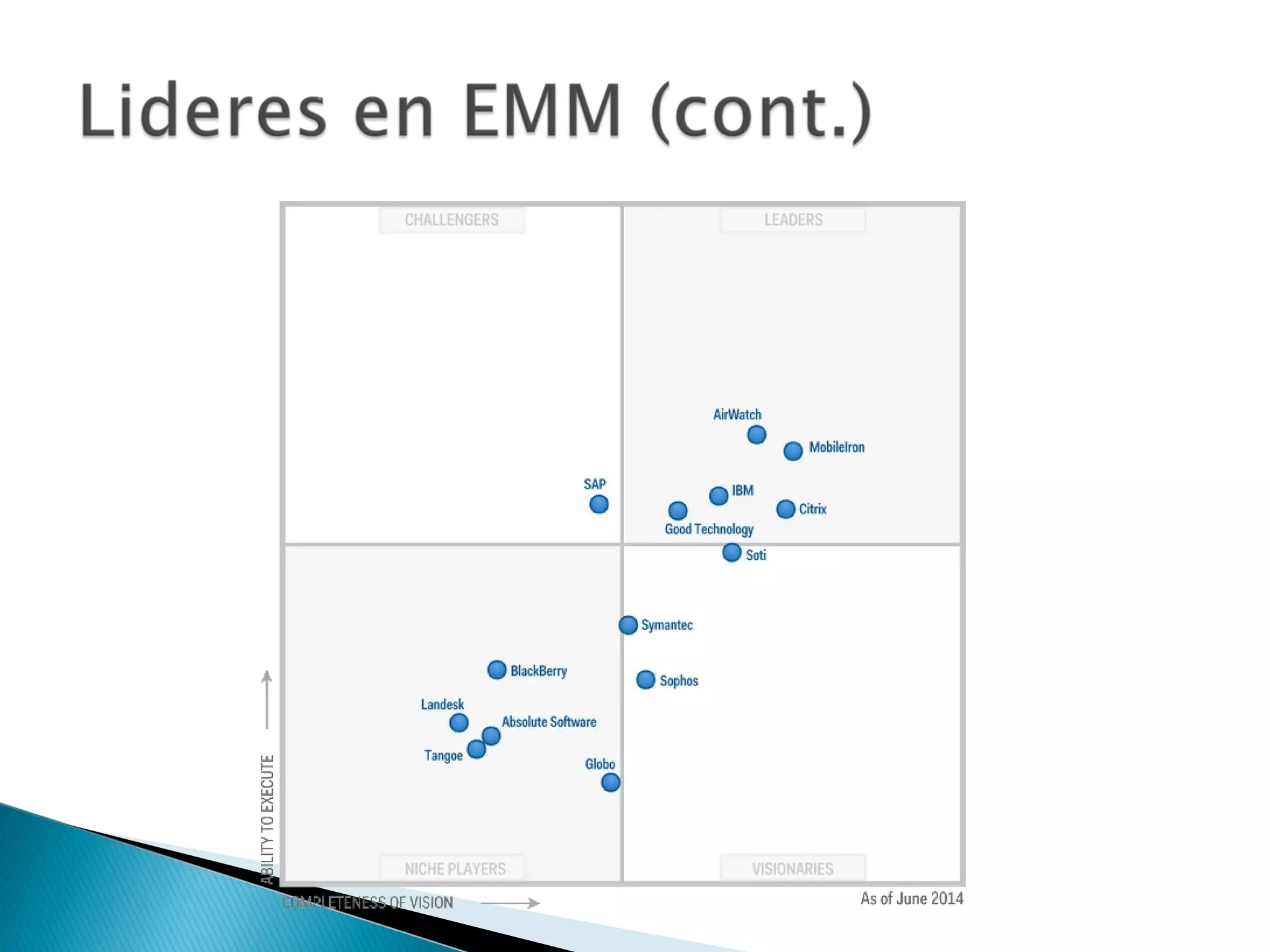 El documento habla sobre la administración de dispositivos móviles en las empresas. Explica que cada vez hay más dispositivos y es necesario prevenir brechas de seguridad. Describe el protocolo OMA DM que permite aprovisionar, configurar y actualizar dispositivos de forma remota usando XML. Finalmente recomienda algunas plataformas de gestión móvil como AirWatch, MobileIron y Maas360 que ofrecen servicios de administración, seguridad y correo corporativo en dispositivos.