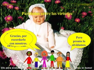 El documento presenta la parábola del buen samaritano. Narra cómo un samaritano ayudó a un hombre que fue asaltado por ladrones, mientras que un sacerdote y un levita pasaron de largo sin ayudarlo. La parábola enseña que debemos compadecernos de los demás y ser solidarios, ya que quienes parecen malos a veces son mejores que los que parecen buenos. Al final, Jesús dice "Ve, y haz tú lo mismo".