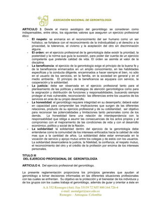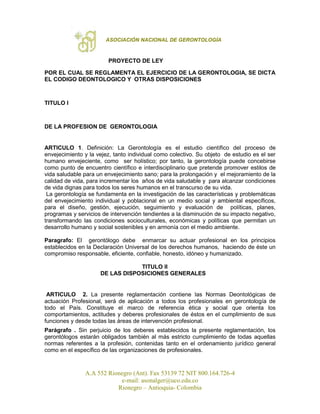 Este documento presenta un proyecto de ley para regular el ejercicio de la gerontología en Colombia. Define la gerontología como el estudio científico del envejecimiento y la vejez desde un enfoque holístico e interdisciplinario. Establece los principios éticos y valores como el respeto, la beneficencia y la justicia que deben guiar a los gerontólogos. Delimita las funciones y áreas de desempeño de los gerontólogos, incluyendo la investigación, docencia, asesoría, diseño de