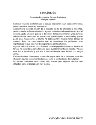 Este documento discute las ventajas y desventajas de la escuela tradicional en comparación con la educación progresista. Tradicionalmente, el maestro transmitía conocimiento y los estudiantes debían memorizar, aunque los castigos eran severos. Ahora, los estudiantes olvidan conocimientos básicos, pero los métodos punitivos ya no se usan. La escuela tradicional tuvo aspectos positivos pero también métodos de castigo excesivos.