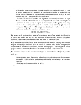 Este documento describe los conceptos de sentencia y sentencia ejecutoria en el sistema legal. Una sentencia es la resolución final de un juez o tribunal que decide el fondo de un litigio o controversia. Para ser válida, una sentencia debe cumplir con ciertos requisitos como juzgar solo sobre el delito acusado y no uno distinto. Una sentencia ejecutoria es aquella que ya no admite recursos legales ordinarios porque las partes no la impugnaron o porque la ley así lo dispone.