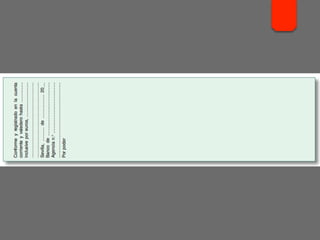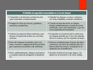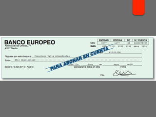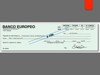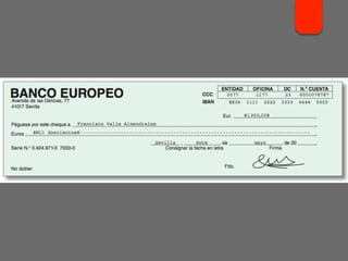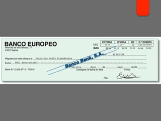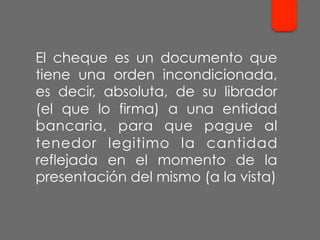 El documento describe los diferentes tipos de cheques y sus características. Menciona que el cheque es un documento que ordena a un banco pagar una cantidad determinada a su tenedor, y describe los requisitos de emisión y cobro. También explica los diferentes tipos de cheques según su beneficiario o requisitos para su cobro, como cheques cruzados o cheques de viajero.