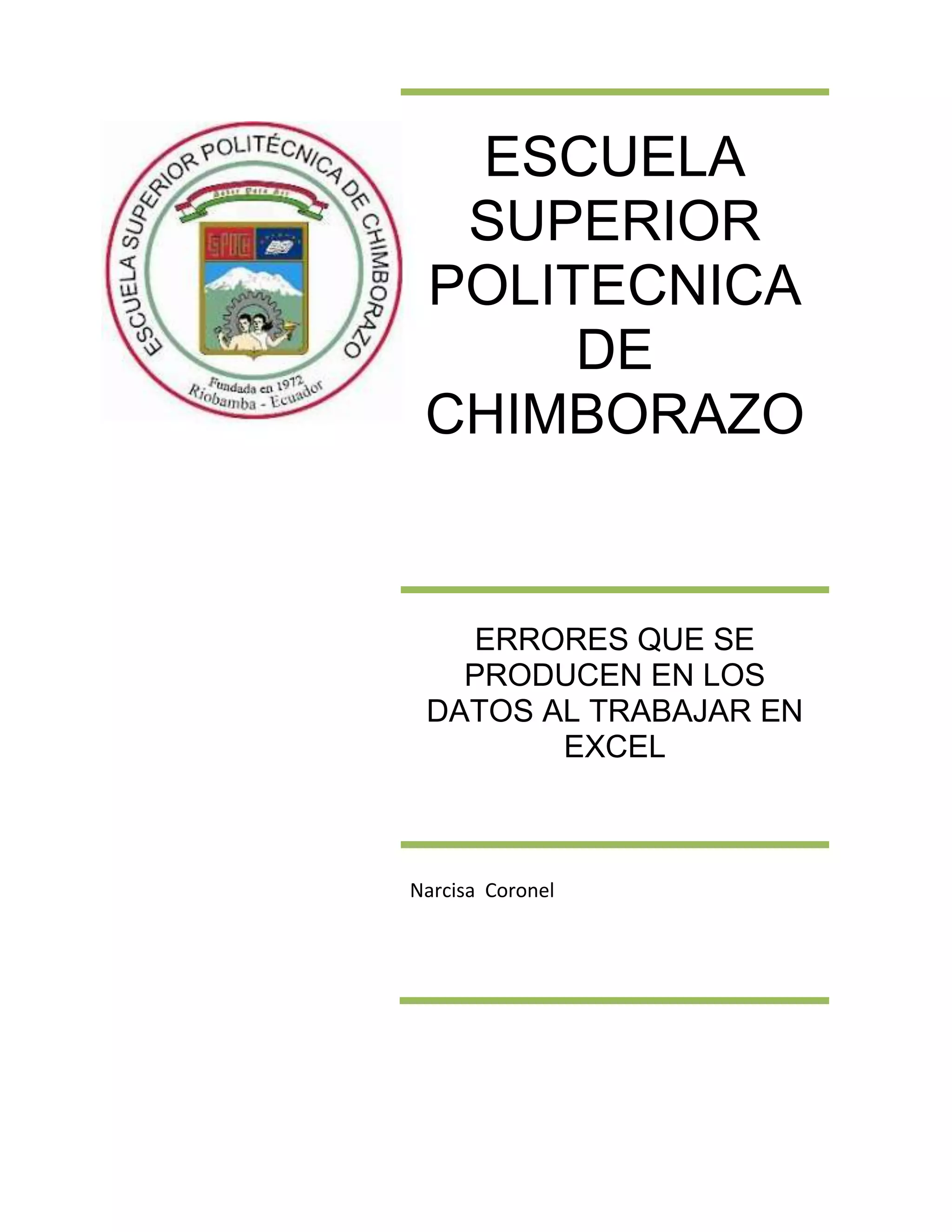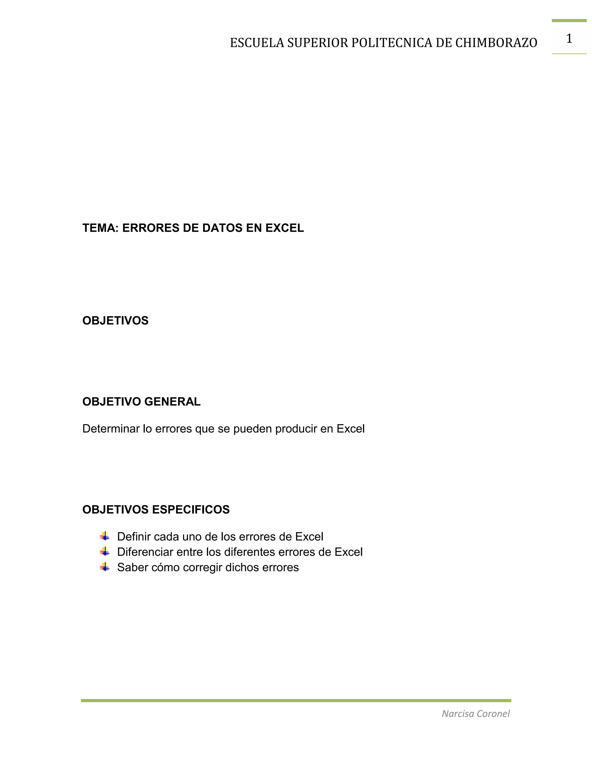 El documento describe los errores que pueden producirse al trabajar con datos en Excel. Explica que Excel utiliza cuatro técnicas para identificar errores como cuadros de diálogo, símbolos en las celdas, valores en las celdas y errores en macros. Luego detalla ocho tipos comunes de errores como #¡NOMBRE?, #¡VALOR!, #¡NUM!, #¡DIV/0!, #¡REF!, #¡NULO!, #N/A y #####, describiendo las causas y soluciones para cada uno. El objetivo es ayudar a los usuarios
