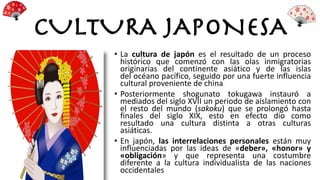 La cultura japonesa es el resultado de oleadas migratorias del continente asiático y las islas del Pacífico, seguidas por una fuerte influencia cultural china. Posteriormente, el shogunato Tokugawa estableció un periodo de aislamiento que dio como resultado una cultura distinta a otras asiáticas. En Japón, las relaciones personales están muy influenciadas por ideas como el deber, el honor y la obligación, lo que representa una costumbre diferente a la cultura individualista occidental.