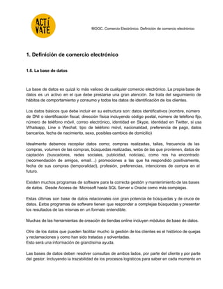 La base de datos es un activo valioso para cualquier comercio electrónico ya que permite el seguimiento de hábitos de los clientes y la recopilación de datos como compras realizadas, preferencias e intenciones de compra futuras. Los programas de software como Microsoft Access, SQL Server u Oracle pueden almacenar y gestionar grandes cantidades de datos de clientes e historiales de compras y quejas de manera relacional. Además de datos identificativos y de contacto, la base de datos debe incluir datos sobre el comportamiento de compra de los clientes para