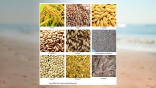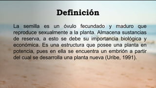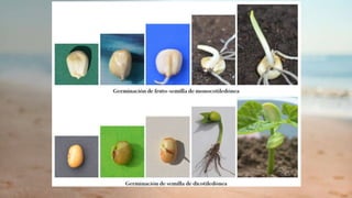 Este documento describe la estructura y función de las semillas. Explica que las semillas almacenan sustancias de reserva y contienen un embrión que permite desarrollar una nueva planta. Detalla las partes clave de las semillas de dicotiledóneas como el fríjol, incluyendo el tegumento, el embrión con cotiledones y epicótilo/hipocótilo, y el endospermo. También cubre las semillas de monocotiledóneas como el maíz, con un solo cotiledón, co