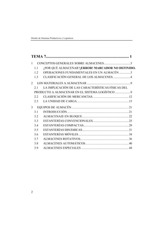 Este documento presenta conceptos generales sobre almacenes. Explica las operaciones fundamentales en un almacén como la entrada, almacenamiento, recogida de pedidos, agrupación y salida de bienes. Además, clasifica los almacenes según su relación con el flujo de producción, ubicación, material almacenado, grado de mecanización, localización y función logística. Finalmente, analiza los materiales a almacenar y cómo sus características físicas afectan al diseño del sistema logístico.