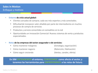 El documento presenta los servicios de optimización de procesos comerciales de la empresa Sales in Motion. Describe el entorno actual de crisis para las empresas y los retos que enfrentan para mantener márgenes, clientes y crecimiento. Sales in Motion ofrece soluciones enfocadas en la estrategia comercial, inteligencia de negocio, campañas, formación y redes comerciales para ayudar a las empresas a enfrentar estos desafíos. Presenta al equipo de la empresa y sus áreas de especialización.