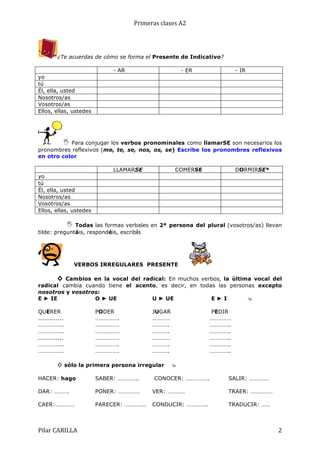 El documento presenta una lista de vocabulario en español para la clase A2, incluyendo adjetivos para describir la personalidad y verbos comunes. También incluye ejercicios para practicar los tiempos verbales como el presente de indicativo y el pretérito perfecto.