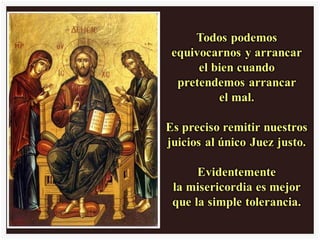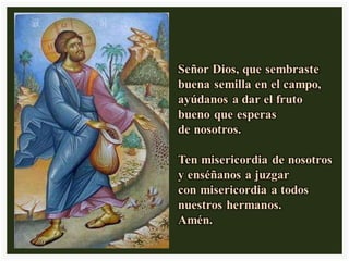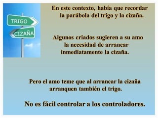 La parábola del trigo y la cizaña enseña que no debemos arrancar la cizaña (mal) prematuramente porque podríamos arrancar también el trigo (bien), y que ni los intransigentes que quieren acabar con el mal de inmediato ni los indiferentes que no distinguen el bien del mal tienen la razón definitiva, pues ninguno de nosotros es el juez final de la historia.