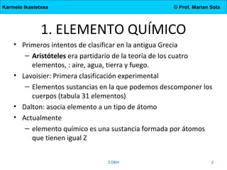 Este documento describe los elementos químicos, el sistema periódico, los tipos de enlace (iónico, covalente y metálico), y las propiedades de los compuestos formados por cada tipo de enlace. Explica que los elementos son sustancias formadas por átomos con el mismo número atómico y cómo el sistema periódico los organiza en períodos y grupos con propiedades similares. Además, define moléculas, cristales, y las características de los compuestos iónicos, moleculares, cristalinos coval