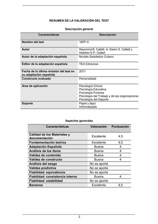 El 16PF-5 es un cuestionario de personalidad que evalúa 16 rasgos de personalidad y 5 dimensiones globales. Mide rasgos como afabilidad, estabilidad, dominancia, atención a normas, apertura al cambio y tensión. Proporciona resúmenes individualizados útiles en áreas como la psicología clínica, la orientación profesional y la investigación sobre personalidad. El cuestionario tiene buenas propiedades psicométricas y es uno de los tests de personalidad más utilizados, aunque se recomienda continuar mejorando la