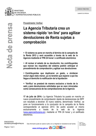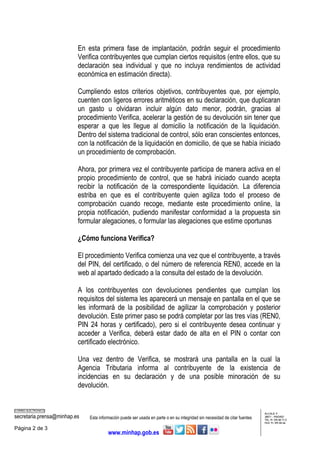 La Agencia Tributaria de España ha creado un nuevo sistema llamado "Verifica" que permite a los contribuyentes comprobar rápidamente en línea el estado de sus devoluciones de impuestos sobre la renta sujetas a verificación y agilizar el proceso si cumplen ciertos requisitos, como tener errores menores en la declaración. El sistema les notifica posibles minoraciones y les da la opción de aceptar la propuesta o presentar alegaciones de forma electrónica sin esperar una notificación impresa. Esto acelera significativamente el proceso de