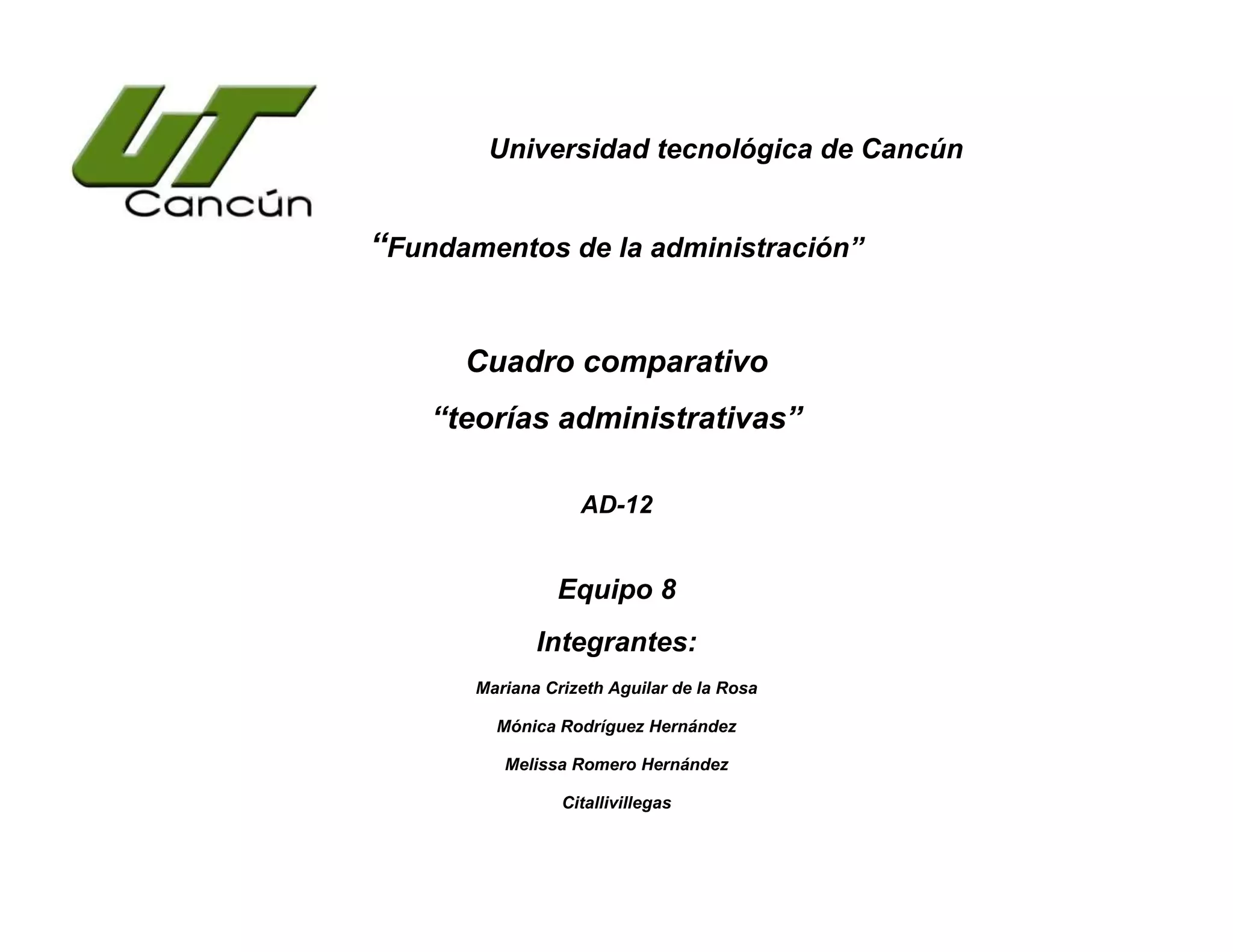Este documento presenta un cuadro comparativo de diferentes teorías administrativas, incluyendo la Revolución Industrial, la Administración Científica de Taylor, el Enfoque Anatómico-Fisiológico de Fayol, la Escuela de las Relaciones Humanas, los Fundamentos de la Teoría Neoclásica, y la Teoría Z. Cada teoría se describe brevemente, identificando sus aportaciones principales, exponentes, seguidores, y período de desarrollo. El documento provee información sobre el contexto histó