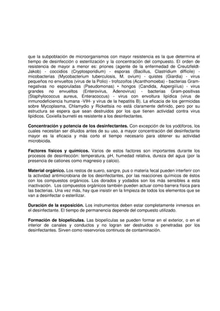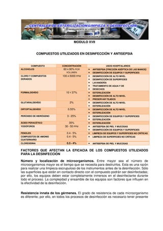 Este documento resume los compuestos utilizados comúnmente en la desinfección y antisepsia en el hospital, incluyendo alcoholes, cloro y compuestos, formaldehído, glutaraldehído y otros. También describe los factores que afectan la eficacia de estos compuestos, como el número y tipo de microorganismos presentes, la resistencia innata de los gérmenes, y la concentración y potencia del desinfectante utilizado.