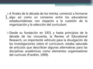 Este documento presenta una discusión sobre el debate histórico en torno a la organización del currículo escolar en Estados Unidos entre las décadas de 1930 y 1950. Por un lado, se promovía una educación funcional y adaptada a la vida, mientras que por otro surgieron proyectos de reforma curricular centrados en las disciplinas académicas como las matemáticas, las ciencias y las humanidades. A principios de la década de 1950 este enfoque disciplinar representó un desafío al modelo de educación funcional y finalmente llevó a su desapar