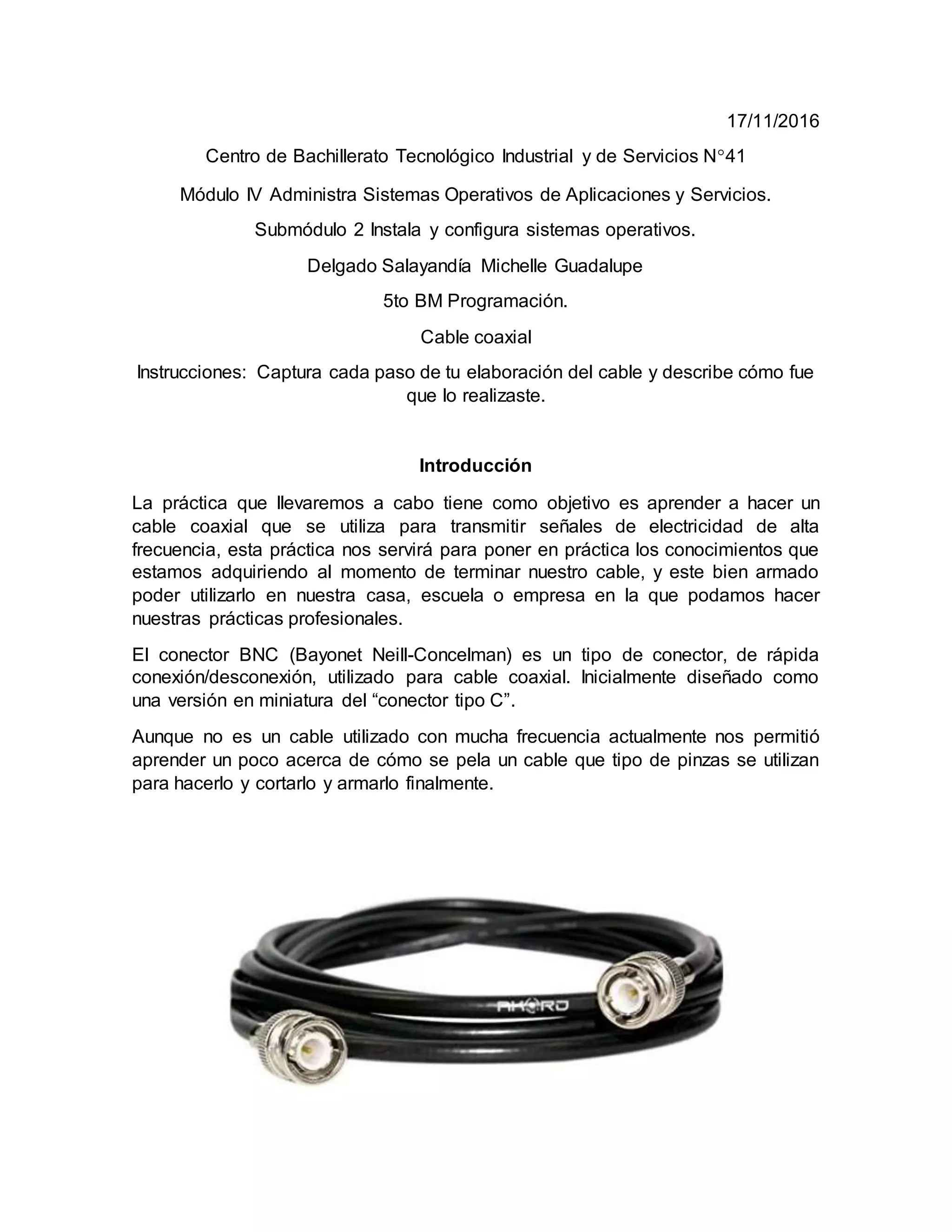 Este documento describe los pasos para crear un cable coaxial utilizando materiales como conectores BNC, cable coaxial RG 58/U y pinzas. Explica que primero se debe pelar el cable a una longitud de 1.5 cm para exponer las capas internas, luego insertar los anillos de los conectores y soldar la punta del cable a la punta del conector. Finalmente, se aprieta el aro metido en el cable para completar su construcción. El propósito es aprender a hacer cables coaxiales que transmitan señales de alta frecuencia de manera