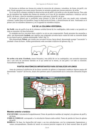 El documento describe los aplomos, o la estructura ósea y angular de las extremidades, en los bovinos. Explica que los aplomos defectuosos pueden reducir el rendimiento y la fertilidad, y son heredables. Detalla los puntos anatómicos clave para evaluar los aplomos, como las articulaciones y ángulos de la columna vertebral y las extremidades. También define las líneas normales de aplomos y los tipos comunes de desviaciones.