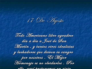 Este documento proporciona información biográfica sobre José de San Martín, incluyendo su lugar y fecha de nacimiento, su familia, su educación en España, su matrimonio, su única hija, sus logros militares como el Combate de San Lorenzo y el Cruce de los Andes, y los detalles sobre su muerte en Francia en 1850.
