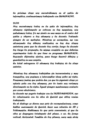 La clase comenzó con una continuación de la lección anterior sobre el pintor Matice. Los estudiantes exploraron su trabajo en el sitio web Uruguay Educa y experimentaron con el programa Sumopaint. Trece estudiantes entregaron trabajos de la clase anterior para su corrección. Mientras los estudiantes continuaron trabajando con Sumopaint, la docente y la practicante discutieron la próxima lección sobre la tridimensionalidad en relación con la obra de Gurvich. Debido a un malentendido con la reserva del laboratorio de informática, la cl