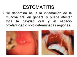 El documento habla sobre estomatitis, una inflamación de la mucosa oral que puede afectar toda la cavidad oral o regiones específicas. Las causas más comunes son infecciones bacterianas, virales o fúngicas. Describe diferentes tipos de estomatitis aguda o crónica, sus síntomas y causas, incluyendo estomatitis micótica, bacteriana, por tuberculosis u otras infecciones. También cubre patologías de la orofaringe y nasofaringe como faringitis, mononucleosis infecciosa y adenoiditis.