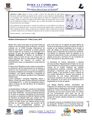 El documento habla sobre varios eventos y actividades culturales, educativas y comunitarias en la Localidad 17 La Candelaria de Bogotá en el mes de mayo de 2016, incluyendo el Día Internacional de los Museos, talleres de escritura, becas, convocatorias, jornadas de salud y reuniones.