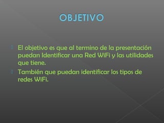 Una red WiFi permite que dispositivos se conecten inalámbricamente a Internet y entre sí. Existen dos tipos de redes WiFi: las redes de infraestructura que usan puntos de acceso, y las redes ad-hoc que conectan dispositivos directamente. Las redes WiFi tienen muchas utilidades como acceder a una red desde cualquier lugar y conectar dispositivos sin cables.