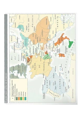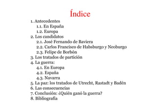 La Guerra de Sucesión española (1700-1713/14) se debió a la disputa sobre quién debía heredar los territorios de la monarquía hispánica tras la muerte sin herederos de Carlos II de España. Los principales candidatos fueron José Fernando de Baviera, Carlos de Habsburgo y Felipe de Borbón. Los tratados de partición buscaron dividir los territorios entre las potencias europeas, pero Carlos II nombró heredero a Felipe de Borbón. Esto llevó a la guerra entre la alianza borbón