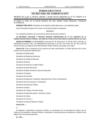 Este documento establece la creación de la Secretaría de Cultura en México a través de la reforma de diversas leyes. Se transfieren atribuciones relacionadas con cultura, patrimonio histórico y artístico, y promoción de las artes de otras secretarías a la nueva Secretaría de Cultura. Además, se especifican las funciones y objetivos principales de esta nueva secretaría, como formular políticas culturales, conservar el patrimonio y promover la cultura en el país.