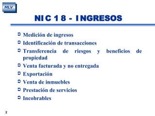 2) Se describen conceptos como medición de ingresos, identificación de transacciones, transferencia de riesgos y beneficios, venta facturada y no entregada, exportaciones, venta de inmuebles y prestación de servicios.