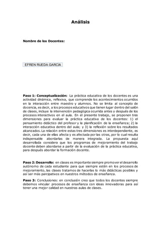 Análisis Nombre de losDocentes: EFREN RUEDA GARCIA Paso 1: Conceptualización: La práctica educativa de los docentes es una actividad dinámica, reflexiva, que comprende los acontecimientos ocurridos en la interacción entre maestro y alumnos. No se limita al concepto de docencia, es decir, a los procesos educativos que tienen lugar dentro del salón de clases, incluye la intervención pedagógica ocurrida antes y después de los procesos interactivos en el aula. En el presente trabajo, se proponen tres dimensiones para evaluar la práctica educativa de los docentes: 1) el pensamiento didáctico del profesor y la planificación de la enseñanza; 2) la interacción educativa dentro del aula; y 3) la reflexión sobre los resultados alcanzados. La relación entre estas tres dimensiones es interdependiente, es decir, cada una de ellas afecta y es afectada por las otras, por lo cual resulta indispensable abordarlas de manera integrada. La propuesta aquí desarrollada considera que los programas de mejoramiento del trabajo docente deben abordarse a partir de la evaluación de la práctica educativa, para después abordar la formación docente. Paso 2: Desarrollo: en clases es importante siempre promover el desarrollo autónomo de cada estudiante para que siempre estén en los procesos de mejoramiento, las clases tratamos de hacerlas lo más didácticas posibles y así ser más parcipativos en nuestros métodos de enseñanza. Paso 3: Conclusiones: en conclusión creo que todos los docentes siempre debemos vincular procesos de enseñanza con ideas innovadoras para así tener una mejor calidad en nuestras aulas de clases.