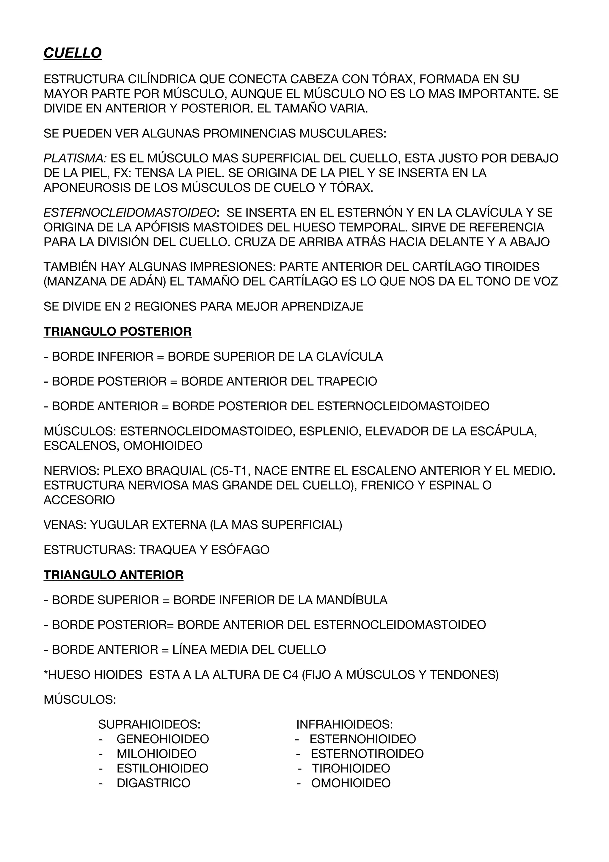 El documento proporciona una descripción detallada de la anatomía del cuello. Resume las principales estructuras del cuello incluyendo los músculos, vasos sanguíneos y nervios. Explica la división del cuello en triángulos anterior y posterior, e identifica los músculos, nervios y vasos asociados con cada región.