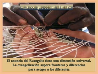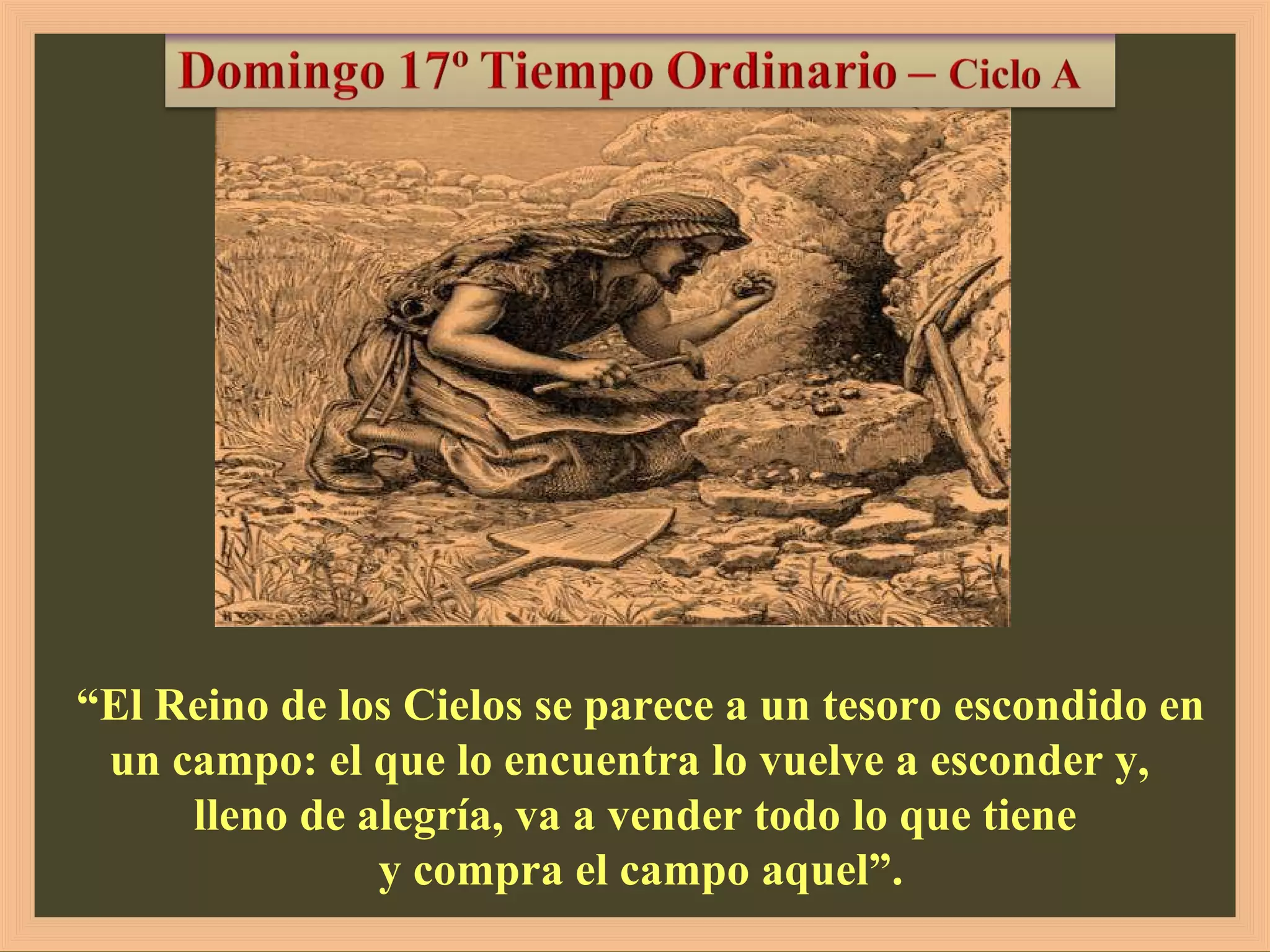 El documento resume tres parábolas de Jesús sobre el Reino de los Cielos: la del tesoro escondido, la perla de gran valor y la red lanzada al mar. Jesús enseña que el Reino de los Cielos vale más que cualquier otra cosa y que vale la pena vender todo lo que se tiene para poseerlo.